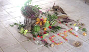 The poster on the wall of the Centre reads, “What future do you prefer, biodiversity or a green desert?” Members of the community association welcome us and tell us that our visit is “an exchange of experience.” Laid out in a circle on the floor are items representing the people’s life and livelihood, including seeds, water, earth, the foods that they grow—all surrounded by pictures of their struggle for land. The letters “CPT” are written in corn and beans.