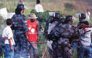 Louisa (inset) begins to tell us their story. There were many moments of adversity and resistance since the action began. After eviction, the people set up a roadside camp, going to the fields each day so that they could continue to plant and tend their crops. They numbered nearly 200 with two or three families in each tent. At night their sleep was disturbed with the vibration of the cars and plantation trucks going past. Sometimes they awoke to gunshots fired by militia hired by the sugar mills to frighten them. These armed thugs, carrying machine guns, chased the people. The police came too, supported by the sugar barons and staying at their big estates.